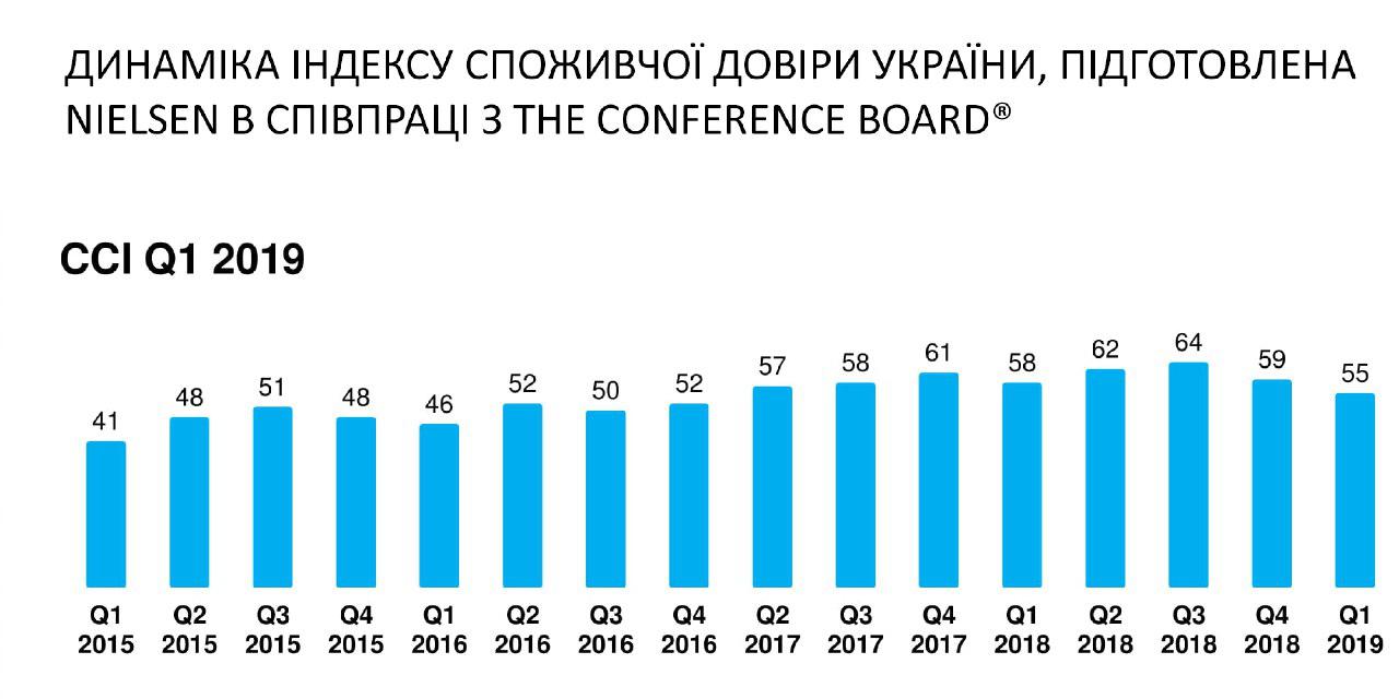Якщо в третьому кварталі 2018 року ще спостерігалось якесь зростання індексу довіри українського споживача, то до першого кварталу 2019 він скотився на цілих 9 пунктів - до позначки в 55.