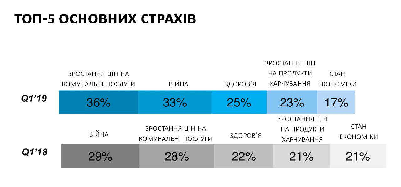 Згідно з дослідженнями Nielsen і The Conference Board, війна тепер лякає українців менше, ніж зростання цін на комунальні послуги. Цей страх обігнав всі інші пункти: здоров'я, економіку, ціни на продукти тощо. Тому вартість газу, світла, води, опалення та інших займають впевнене перше місце в хіт-параді страхів українців.
