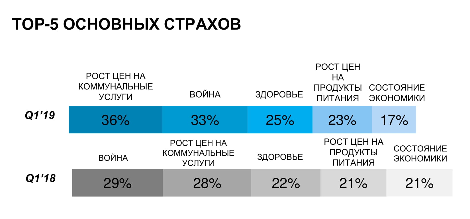 Согласно исследованиям Nielsen и The Conference Board, война теперь пугает украинцев меньше, чем рост цен на коммунальные услуги. Этот страх обогнал все остальные пункты: здоровье, экономику, цены на продукты и тому подобное. Поэтому стоимость газа, света, воды, отопления и прочих занимают уверенное первое место в хит-параде страхов украинцев.