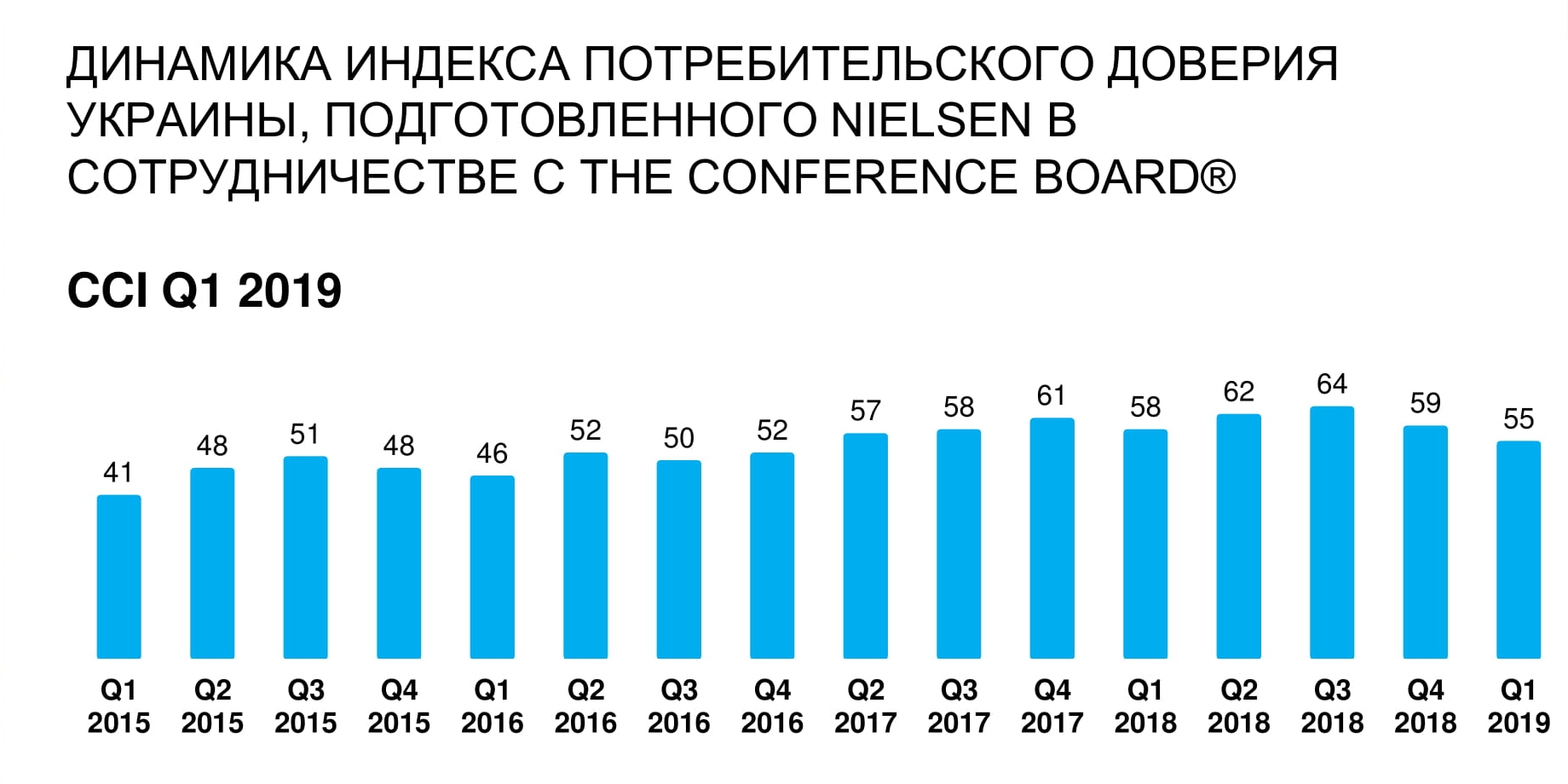 Если в третьем квартале 2018 года еще наблюдался какой-то рост индекса доверия украинского потребителя, то к первому кварталу 2019 он скатился на целых 9 пунктов — до отметки в 55.